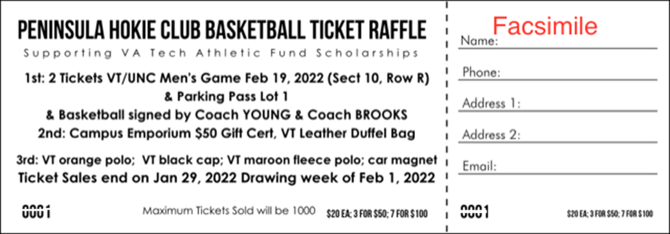 Hokie fans, we need your help to fulfill our Peninsula Hokie Club commitment to raise funds for VT athletic scholarships. As you are aware, COVID-19 has curtailed nearly all of our normal fund-raising events. To help make up for the incoming funds shortfall we are holding a raffle. Please help our fund-raising effort by buying raffle tickets. You could win some great prizes while helping support athletic scholarships!!