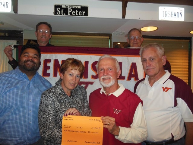 At the monthly club meeting on October 9th at Mike’s Place in Newport News, the club presented it’s annual gift to VTAF. This gift was a check for $9,300 toward the club’s pledge for the Football Practice Facility and was presented to Ms. Terry Bolt, Director of Development for Special Gifts and the Athletic Annual Fund. The funds were raised through various fund-raisers conducted throughout the past year, including our annual golf tourney, football season ticket auctions, and Hampton Festival beer concessions. I wish to thank all the Hokie Reps, Hokie Club members, business sponsors, and all others who helped with our fund-raising efforts.