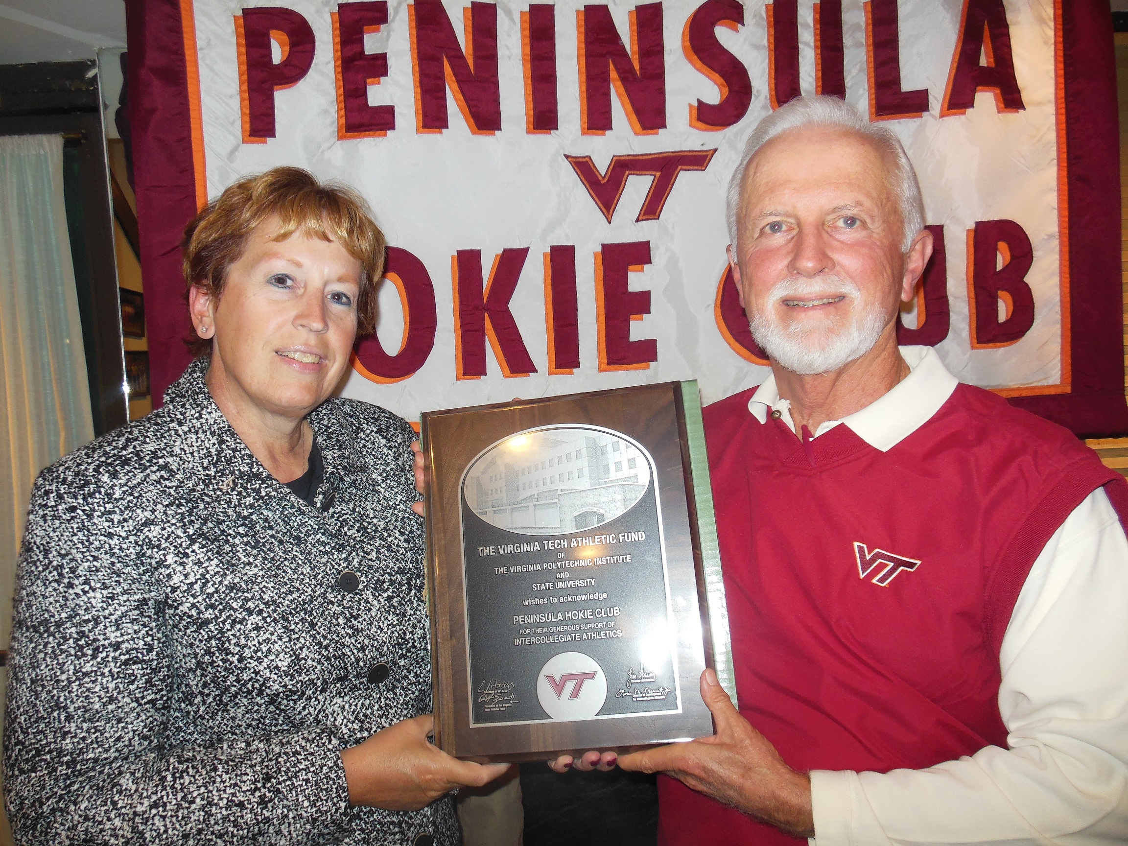 The 2nd picture shows Ms. Terry Bolt presenting a plaque to Frank Seamster, Peninsula Hokie Club President, in recognition of the club’s support for the Football Practice Facility.